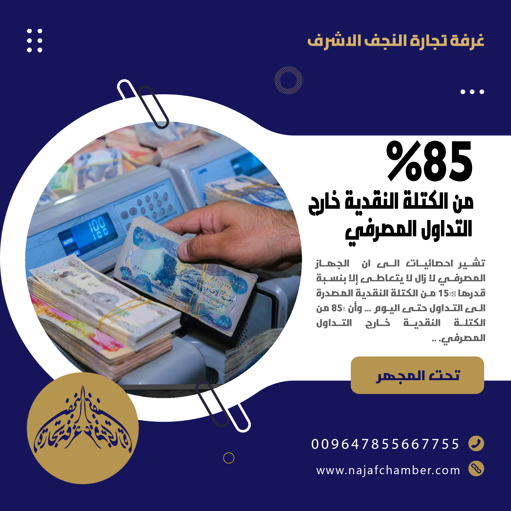 غرفة تجارة النجف الاشرف / 85 % من الكتلة النقدية خارج التداول المصرفي
