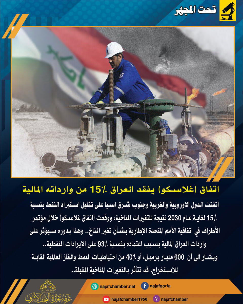 غرفة تجارة النجف الاشرف / اتفاق غلاسكو يفقد العراق 15% من ايراداته